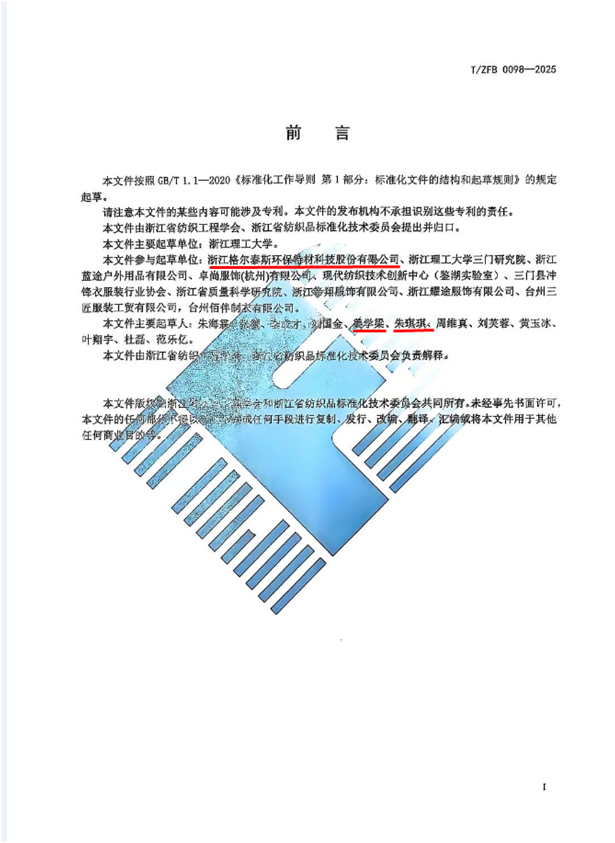 我司參與的《戶外運動沖鋒衣用防水透濕復合面料》團體標準起草工作,該標準經專家審議通過,2025年4月11日起實施。此次參與不僅彰顯了我司在行業內的專業地位與責任擔當,更是對行業規范化、標準化發展的積極貢獻。